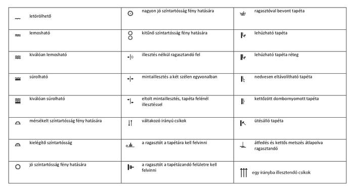 Kérjük ellenőrizze a tapéta címkéjén található jelzés alapján, hogy milyen piktogrammot lát. Az alábbi piktogramok alapján azonosítható be, hogy felhelyezéskor mit kell kenni ragasztóval (tapétát, a falat, vagy mindkettőt)